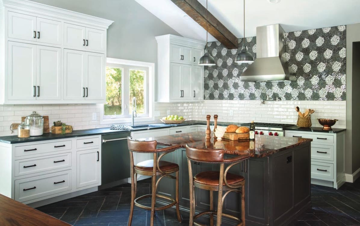 “The overall look wouldn’t be identical while not the beams,” says married woman. conjointly complementing the country feel of the house, the dark, fabric floor tile has hints of wood tones that echo the wood beams on the ceiling. The designer set it during a fabric pattern for a softer foundation against the remainder of the room components.The chrome steel appliances have associate industrial ambience and convey during a additional modern edge. For the female aptitude, the house owner fell enamored with the show-stopping backsplash mosaic tile that has hints of flower styles in different dark colours that obtain on reflective mirror tones. They sparkle each therefore slightly in sure light-weight to enhance the unstained appliances. “The mosaic is therefore distinctive, and footage don’t have sex justice,” married woman says.The backsplash may be a favorite facet of the look for each house owner and designer, however married woman conjointly loves the quantity of natural light-weight that spills into the area, and also the read into the curtilage is breathless. “You feel extremely serene and calm during this room,” she says. “I am happy with however it reflects the homeowner’s style and the way proud she is of this area.” As for the house owner, she says selecting a favourite half is hard. on the far side the backsplash, she conjointly loves the “beautiful combination of various materials” within the area. “Functionally, I love the quantity of cupboard area that married woman worked into the style,” she adds. “For once, we've lots of space to store everything!” See stlouishomesmag.com for resources and extra photos.