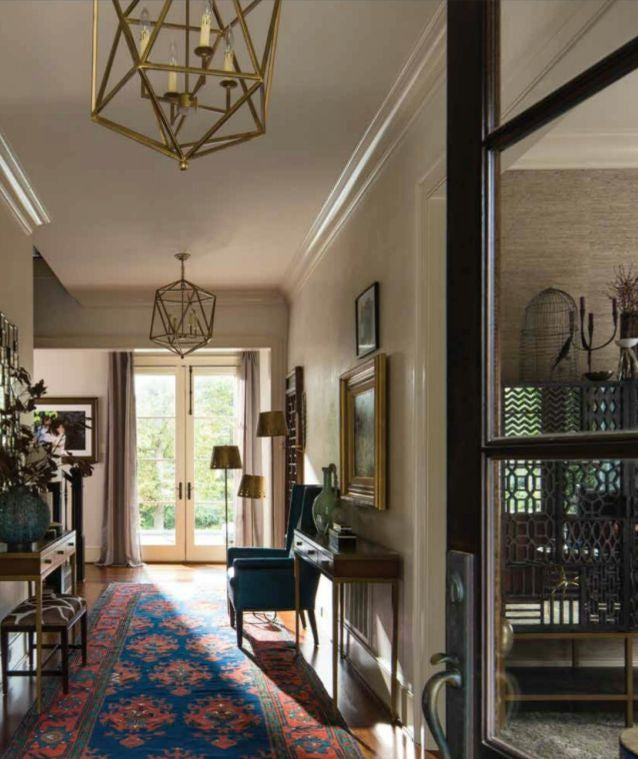 Ā āI think the practicalities of life are my biggest driver in creating good design for my clients,ā Garrett explains. āI have two teenagers at home, and pets, and I am fascinated with how weāve completely changed how we live in a certain room just over a period of a few years.ā To that end, Garrett kept this philosophy in mind when planning the design for the master suite and master bath. The dark green walls, leather furniture, and formal sitting room were exchanged for a brighter, whiter look, a yoga space, and a play area in front of the fireplace to enjoy their children. The resulting bedroom was a true retreat with separate spaces for sleeping and relaxing. The master bath became spacious and bright with a Frenchchic vibe. āWe pulled the shutters off the windows, painted the room white, and filled it with pale textiles - vintage linen, wool, and velvet,ā Garrett says. āAs for the master bath, we removed the vanity and cabinetry, reformatted the placement, and installed a large mirror in front of the window so that light could enter, but privacy was preserved.ā As Garrett says, itās safe to assume that you will never change your personality or patterns just to accommodate a newly decorated room in your home, so itās best to plan it realistically, not ideally. In the case of her clients, formal living and dining rooms were nice in theory but impractical in lifestyle. They were replaced with a music room, complete with piano, and a moody, sophisticated entry and living space including a custom mural that whimsically winds its way up the staircase.