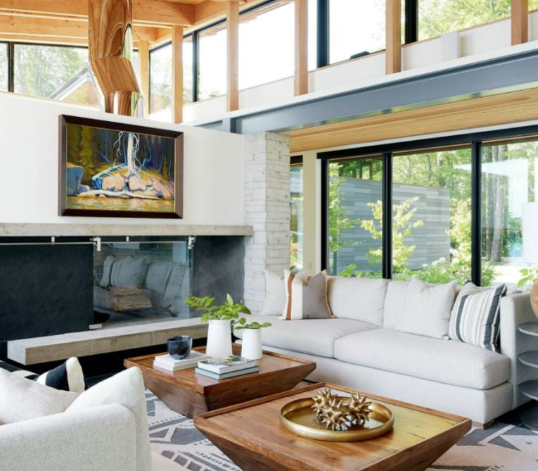 NOT LONG AGO, even newly built cottages favoured a more traditional style, with lashings of gingerbread trim and smaller windows. The results were charming and cosy, butthey also tended to be dark and disconnected from the landscape. So when a couple with grown children who had children oftheir own confessed to Margot Bell and Dasha Ricci of Peaks & Rafters thatthey were ready to replace their family cottage with a design that emphasized light as well as the rugged surroundings,the designers, who specialize in cottage properties, immediately understood. “This was a dream projectfor our clients,” says Dasha. “They wanted something more contemporary.” Since they gravitated toward a modern look, Margot suggested Toronto architect Peter Berton of +VG Architects, whose contemporary sensibility matched the dynamic spirit ofthe project. The new onestorey cottage on Muskoka’s Lake Joseph has a low profile thattucks under a canopy oftrees and hugs the rocks. Peter calls itthe “Bridge House,” a reference to the suspended Muskoka room thatlinks the guest wing to the main cottage. To access the lake, one descends a stairway and passes underneath the room — a pathway that encourages a shift in mind-set. “It delineates a line between the urban life they’ve left behind and cottage life,” says Peter. “There’s a looking glass thing that happens, like you’ve crossed a threshold.” Margot points out that the walk is just as moving in reverse. “The cottage is equally beautiful when you walk up from the water,” she says. The interior’s expansive windows, complemented by natural materials and ample glazing, give the impression of being outside when indoors. “Even when it rains here, it’s bright without lights,” says Peter. “You can still see the lake — you can see everything.” A predominantly white palette enhances the effect and creates a loft-like gallery feeling, especially with the clients’ extensive art collection. The kitchen boasts sleek white, wood and steel cabinets from Italy, and contemporary and mid-century modern furnishings accent porcelain tile floors that have the look of polished concrete. “Contemporary style can be a little cool and daunting,” says Margot. “We tried to keep the warmth. Even though there’s steel and concrete, the cottage connects you to the outdoors and feels friendly.” Creating thatfeeling was key for the owners, who often entertain friends and family. “When they have a party, people floatfrom the cottage to the patio to the boathouse,” says Margot. “The property is beautiful for that kind of easy summer entertaining.” Setting the mood is as simple as taking a stroll under the bridge.