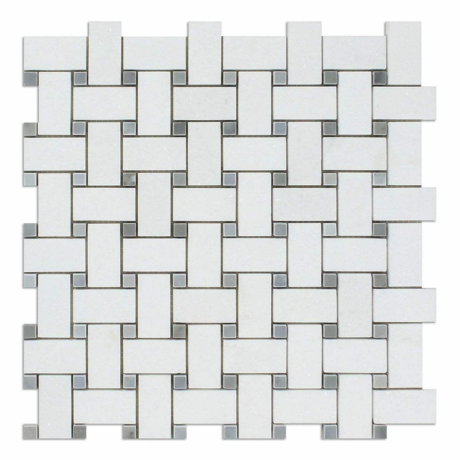 Premium Quality GREEK THASSOS WHITE MARBLE POLISHED BASKETWEAVE MOSAIC TILE w/ BLUE-GRAY DOTS