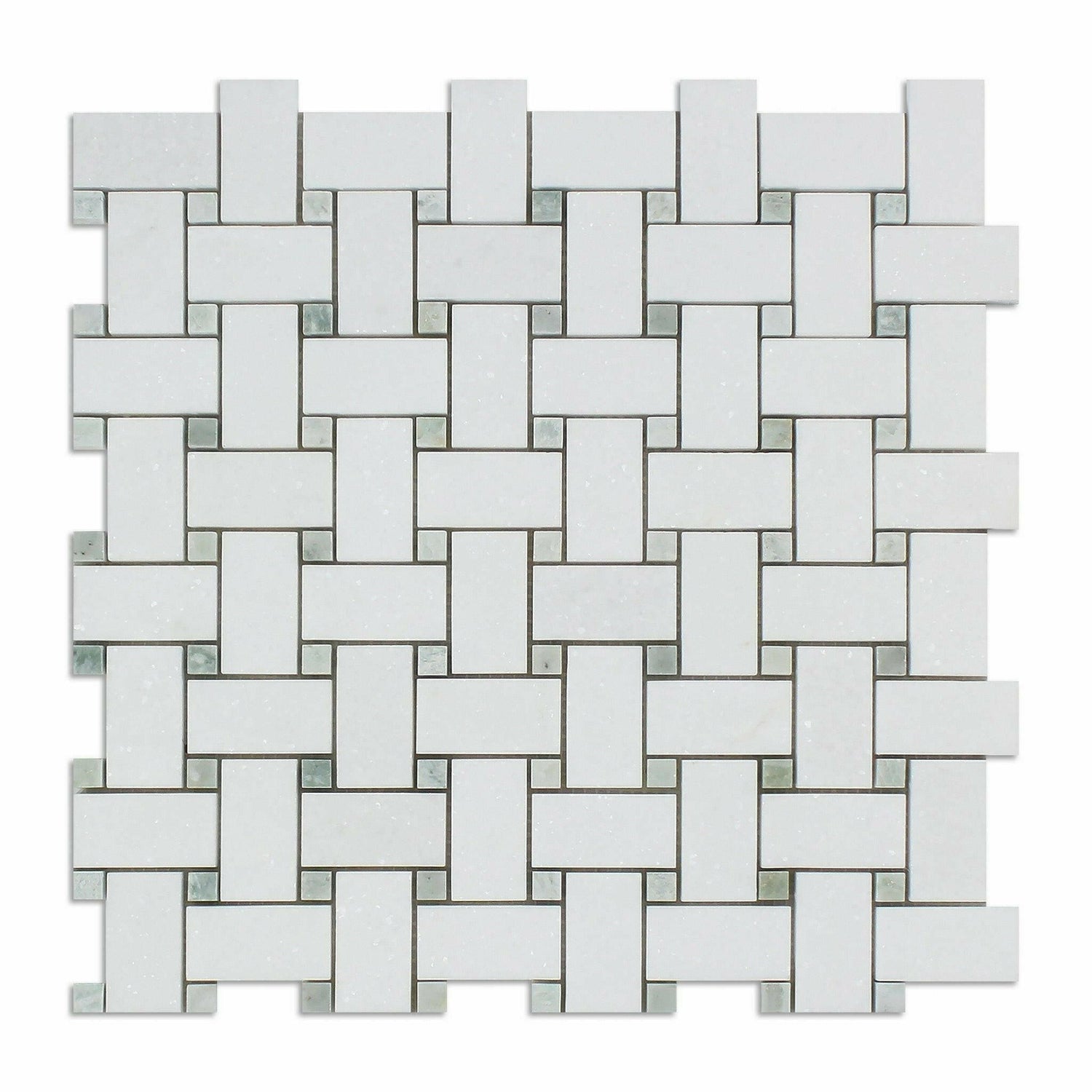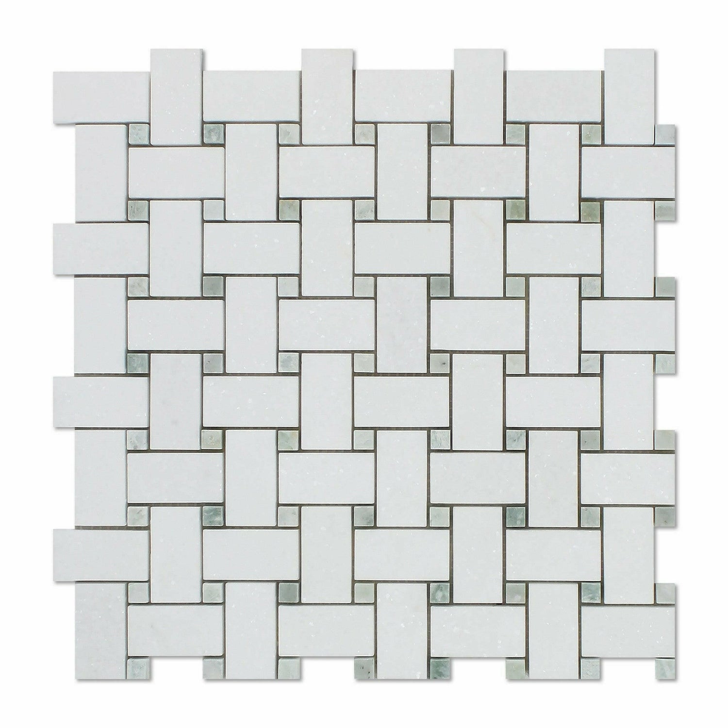 Premium Quality GREEK THASSOS WHITE MARBLE POLISHED BASKETWEAVE MOSAIC TILE w/ MING-GREEN DOTS