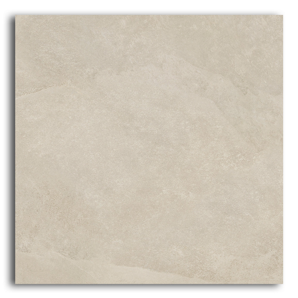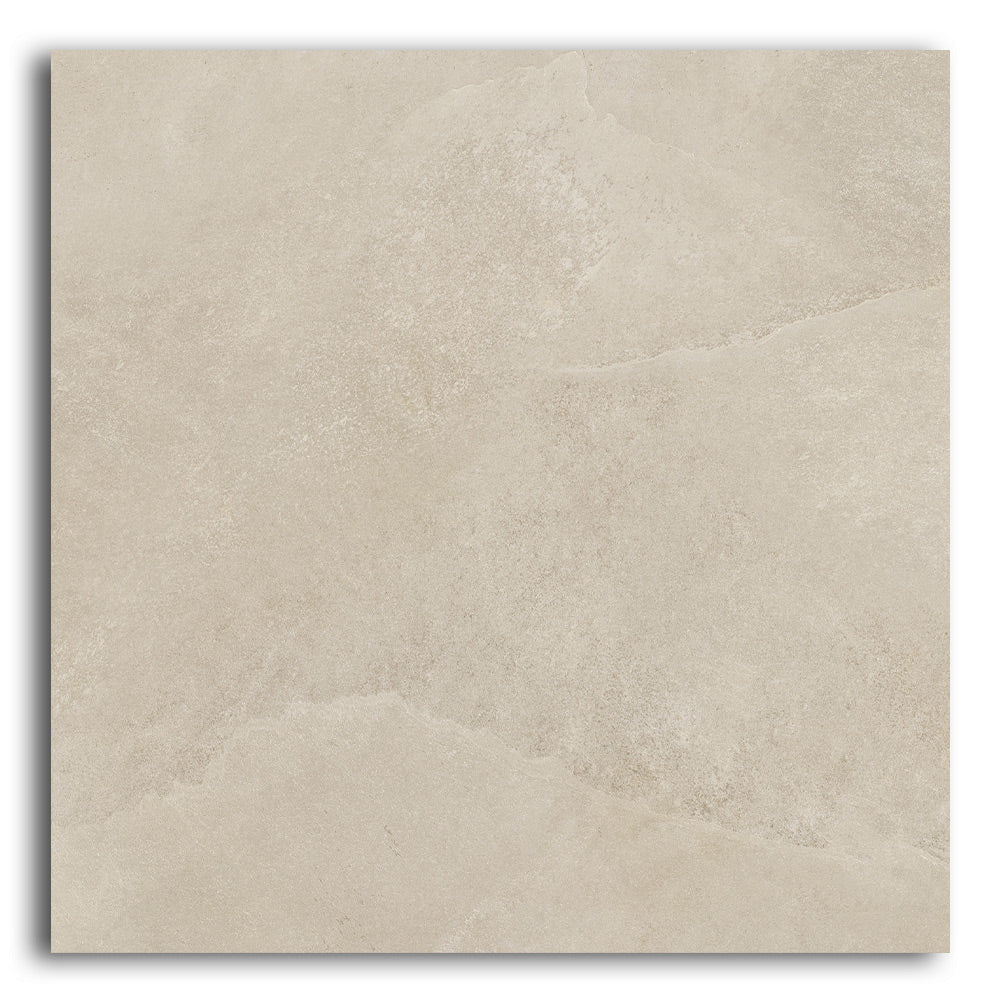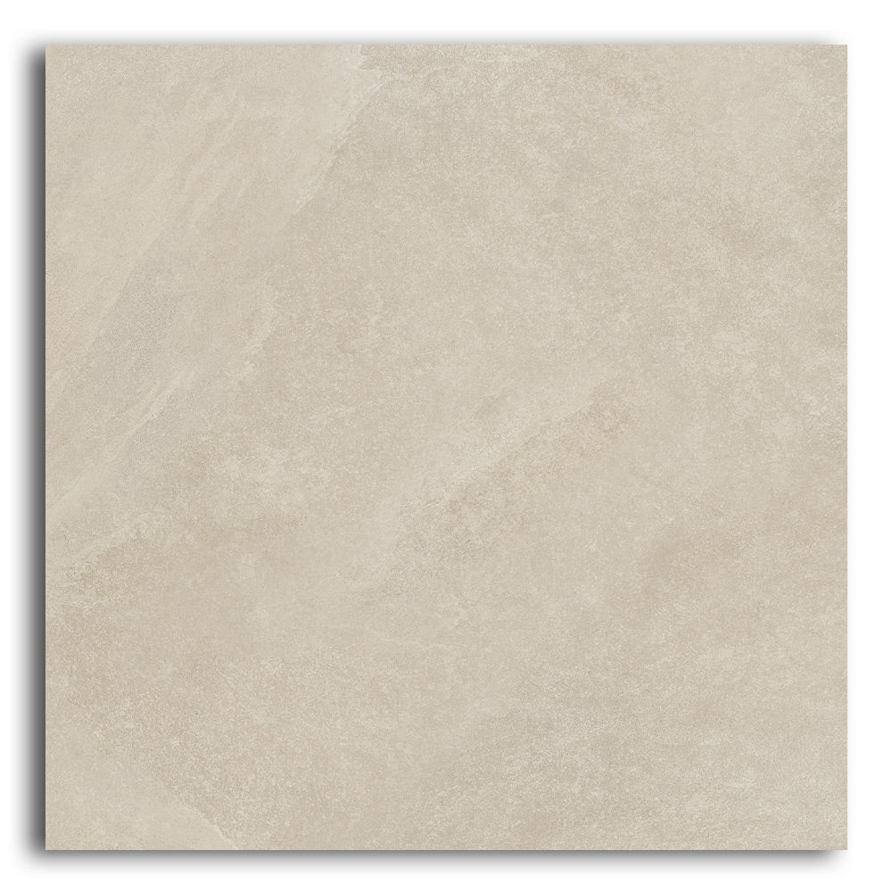 The Ecoslate Beige porcelain tile features subtle slate textures in a warm, sandy beige tone. Each 36x36 inch tile covers more area with fewer grout lines, helping to visually expand your space. Additionally, the natural matte finish softens the surface while providing improved slip resistance—perfect for busy or moisture-prone areas.