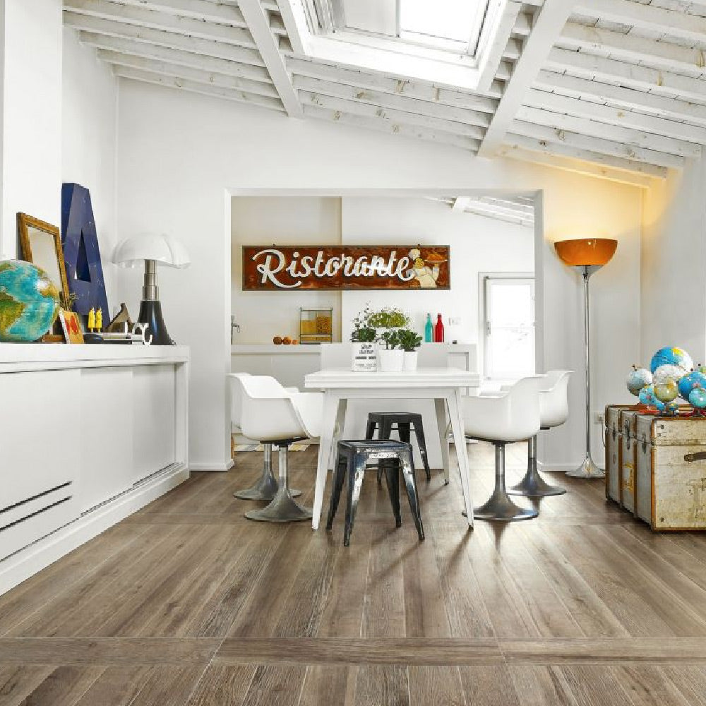 This tile is highly versatile. Use it in open-plan living areas, serene bedrooms, or busy kitchens. In addition, it’s a smart choice for bathrooms, laundry rooms, and entryways—anywhere real wood might not hold up well.