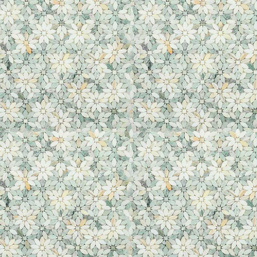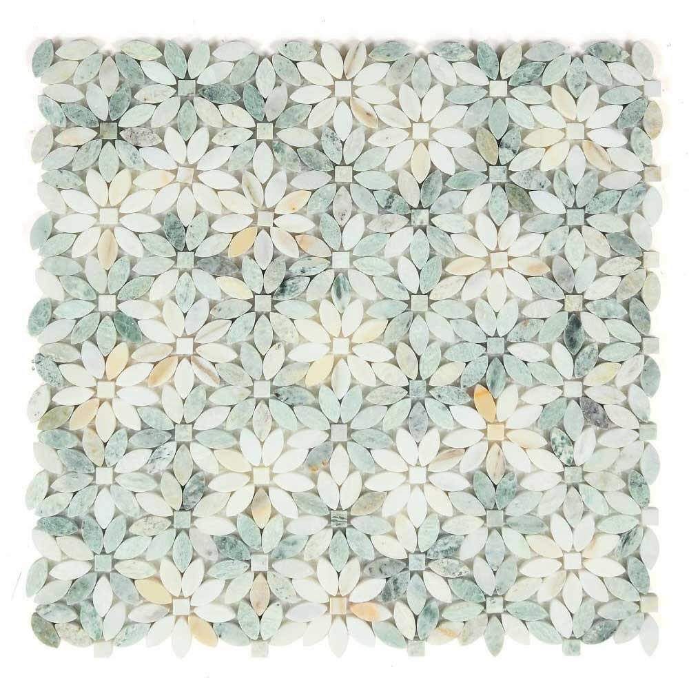 Order today and elevate your space with the exquisite beauty of the Aster Wild Green Flower Marble Mosaic Tile.