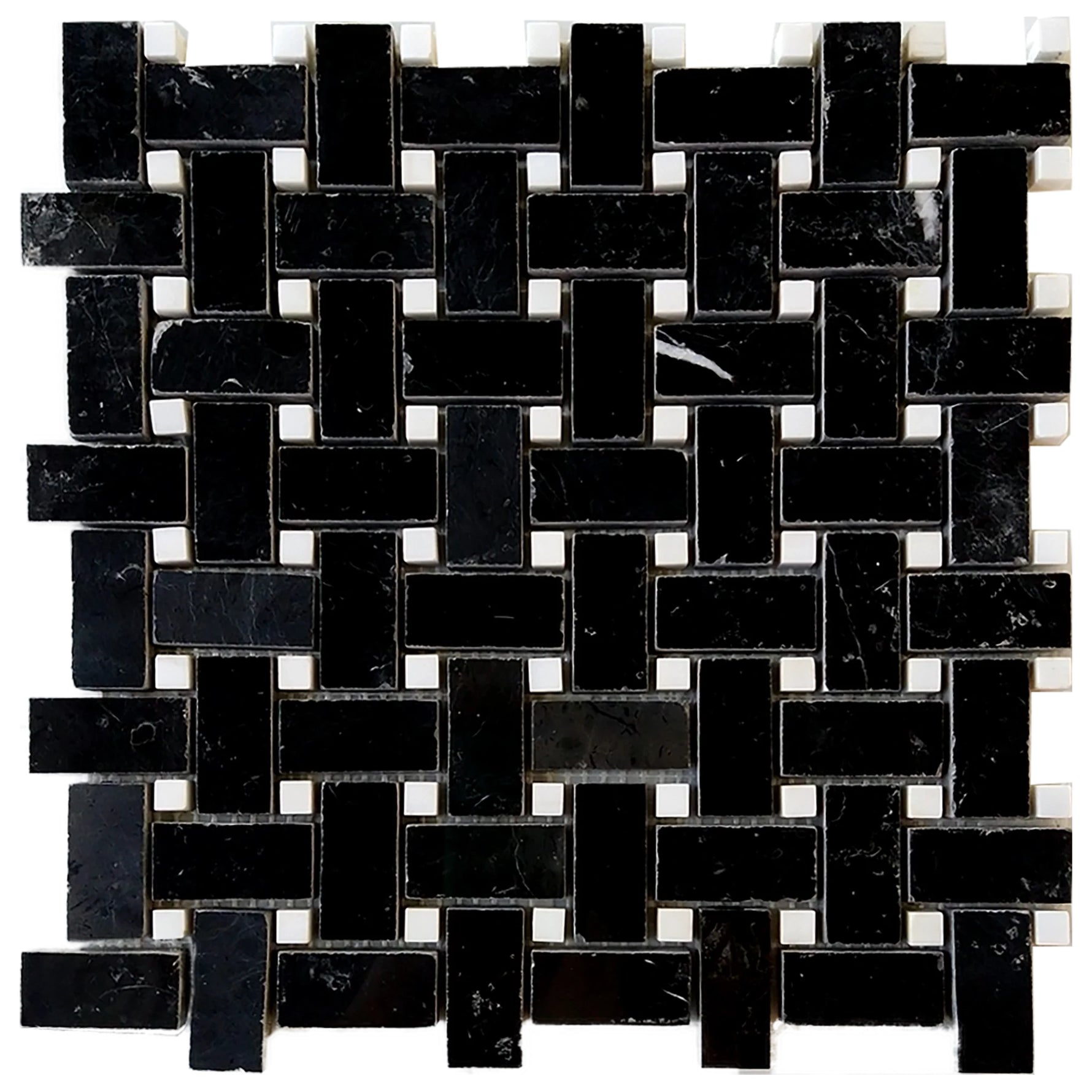 Black Marquina Marble Polished Basketweave Mosaic Tile w/ White Dots