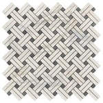 Calacatta Gold Marble Polished Stanza Basketweave Mosaic Tile w/ Blue-Gray Dots