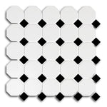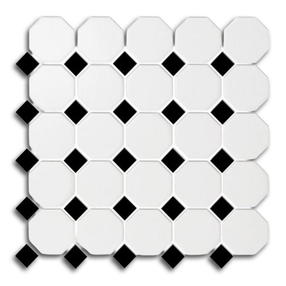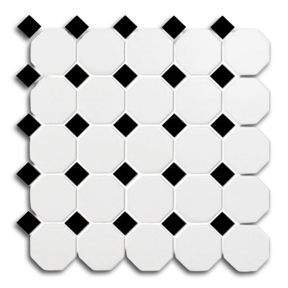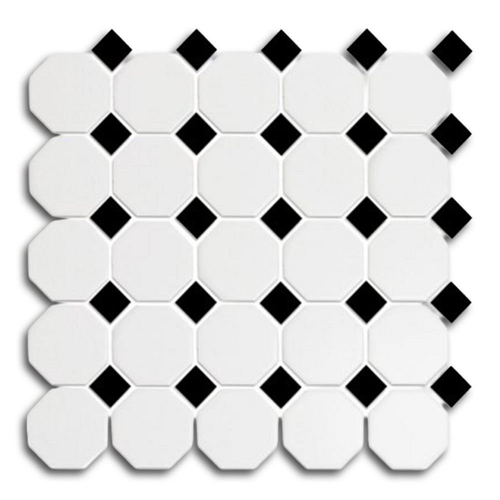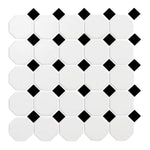 Each mosaic sheet consists of classic octagon-and-dot tiles, arranged on a mesh backing for easy alignment and installation. The matte finish softens the look while adding slip resistance, making this tile an excellent option for wet or high-traffic areas. Additionally, the clean white base paired with sharp black accents brings balance and sophistication to any room.
