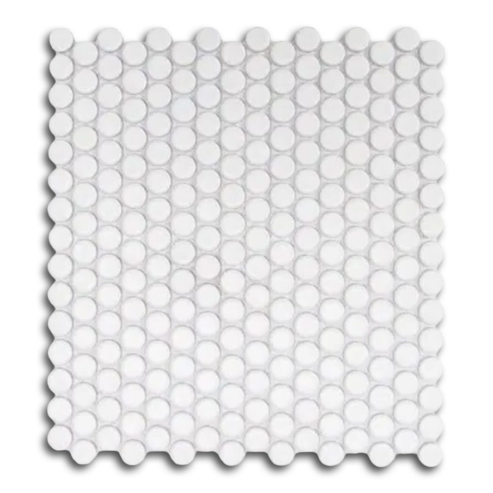 Brighten up your space with the crisp, timeless look of the Cerelia White Glossy Penny Porcelain Mosaic Tile. Featuring a classic round format and a high-shine finish, this tile brings a clean, retro-inspired charm to any wall or floor. Its bright white tone reflects light beautifully, making small spaces feel open and fresh.