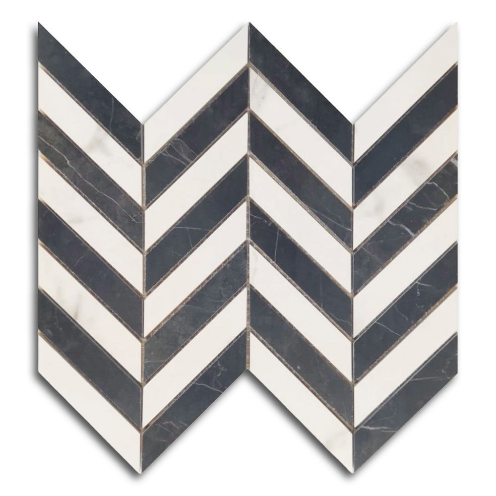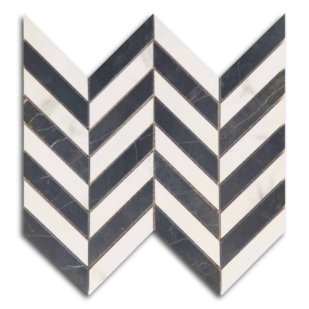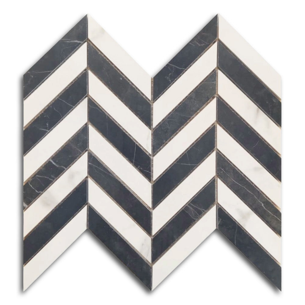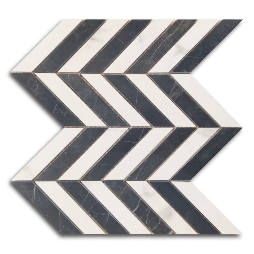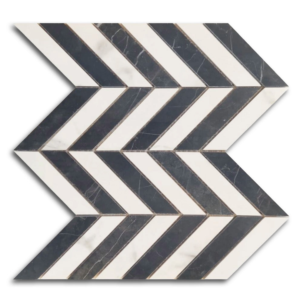 From the moment you see it, this porcelain mosaic tile stands out with its contrasting marble tones. The crisp veining of Statuario and the rich depth of Marquinia are arranged in an angular chevron layout that adds energy and movement. Meanwhile, the Lucido polished finish enhances both color and clarity, reflecting light and making every detail pop.