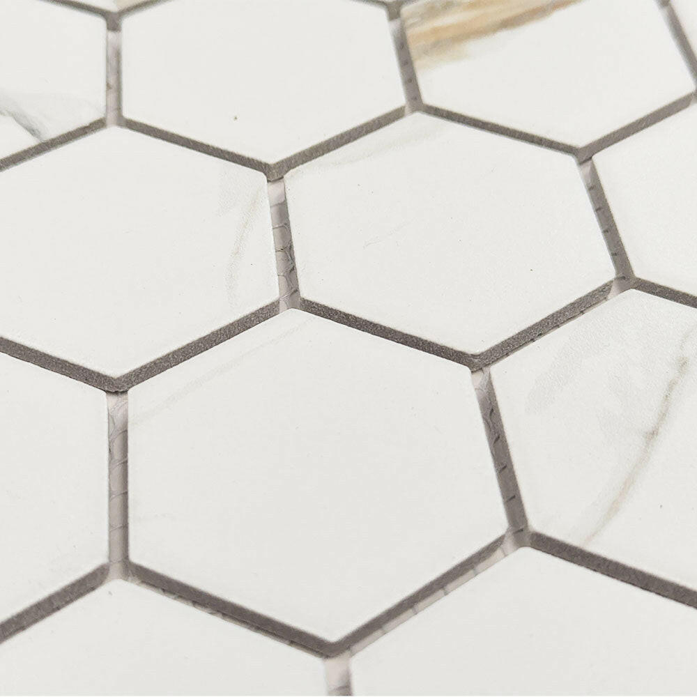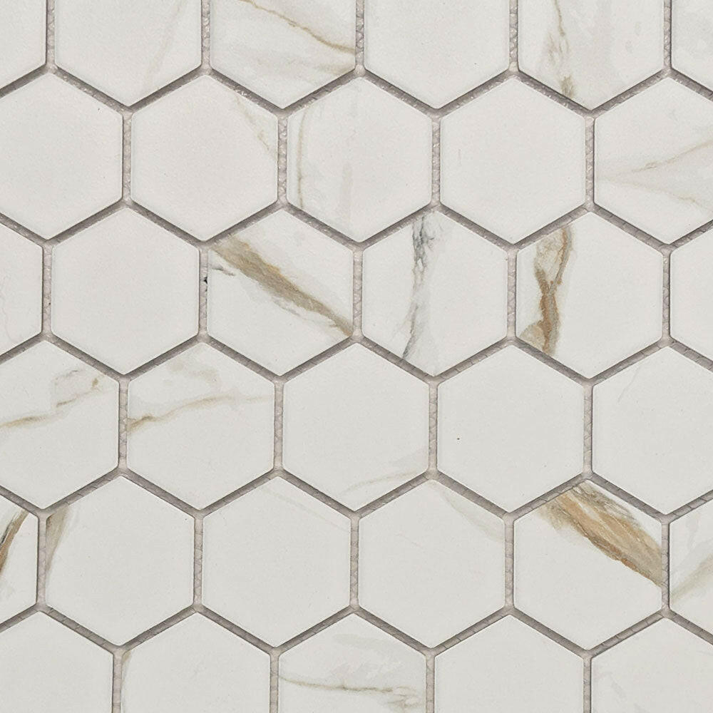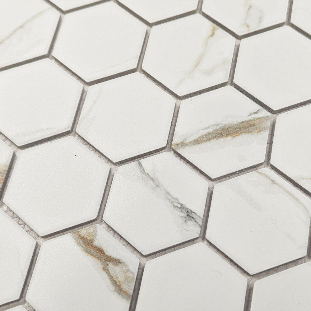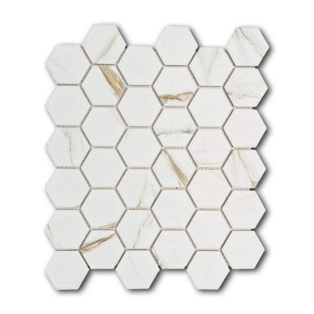 Introducing the Milano Gold Matte 2" Hexagon Porcelain Mosaic Tile, a sophisticated and durable choice for homeowners, renovators, and real estate professionals looking to enhance their interiors. Designed with precision, this porcelain mosaic tile mimics the refined elegance of natural marble, offering a luxurious aesthetic with the added benefit of long-lasting performance.