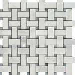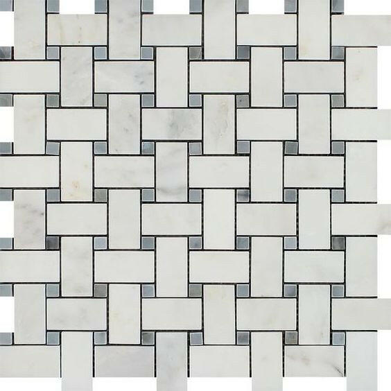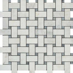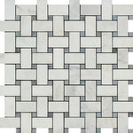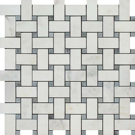Premium Quality ORIENTAL WHITE / ASIAN STATUARY MARBLE POLISHED BASKET WEAVE MOSAIC TILE W/ BLUE-GRAY DOTS