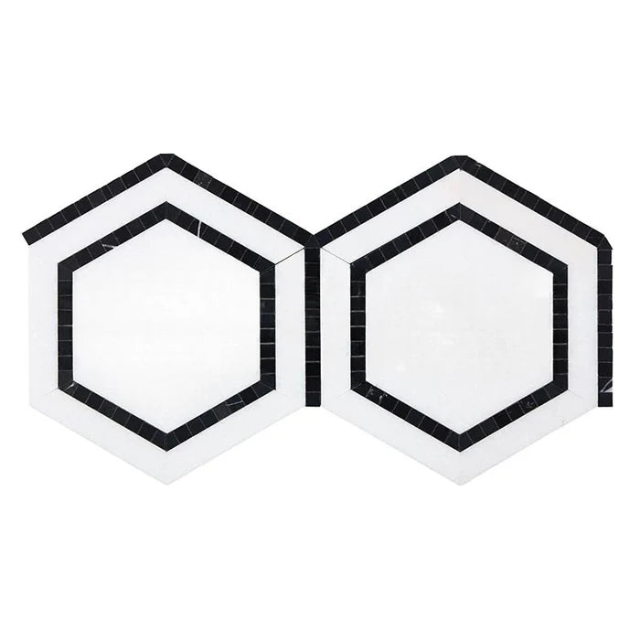 Thassos White Marble Honed 5" Hexagon Combination Mosaic Tile w/ Black Border