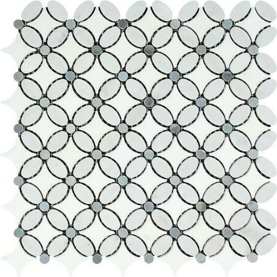 Premium Quality GREEK THASSOS WHITE MARBLE POLISHED FLORIDA FLOWER MOSAIC TILE (Thassos + White Carrara (Oval) + Blue-Gray (Dots))