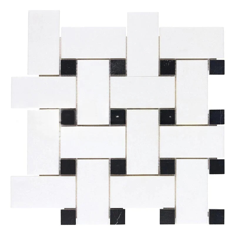 Thassos White Marble Polished Large Basketweave Mosaic Tile w/ Black Dots