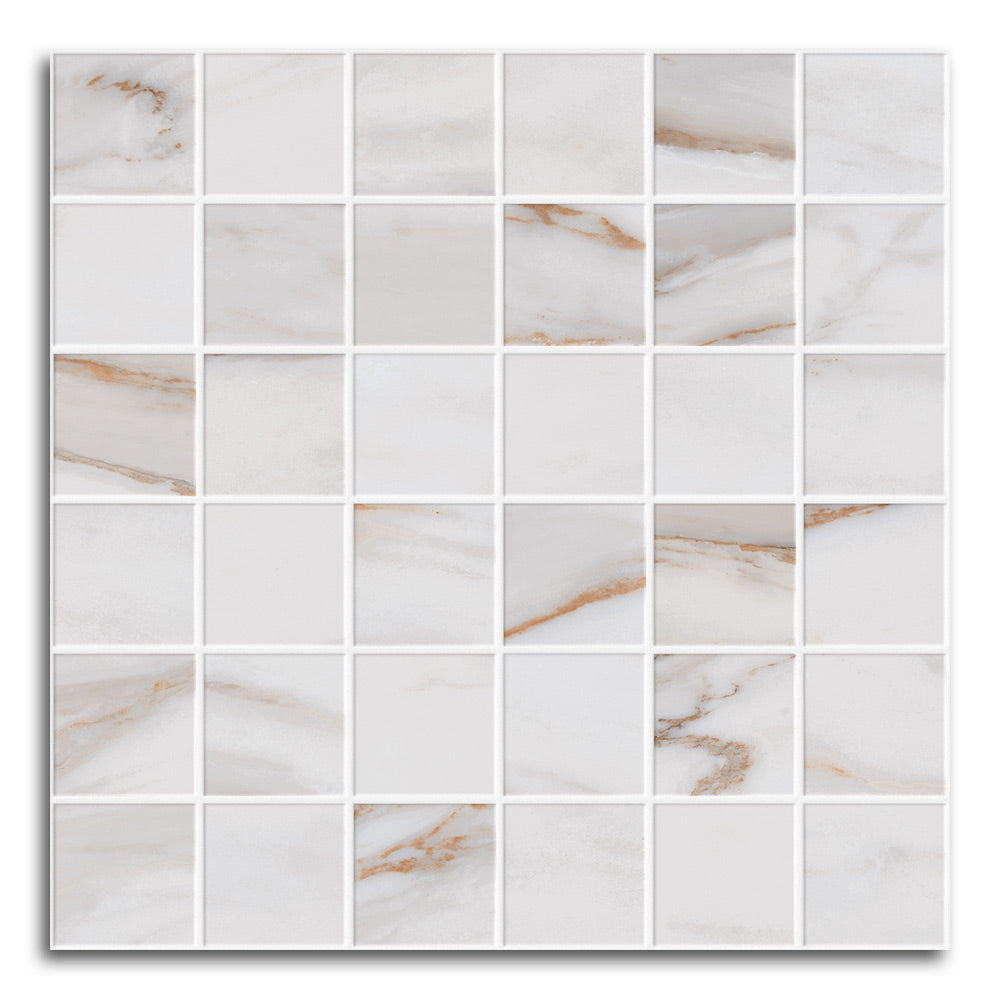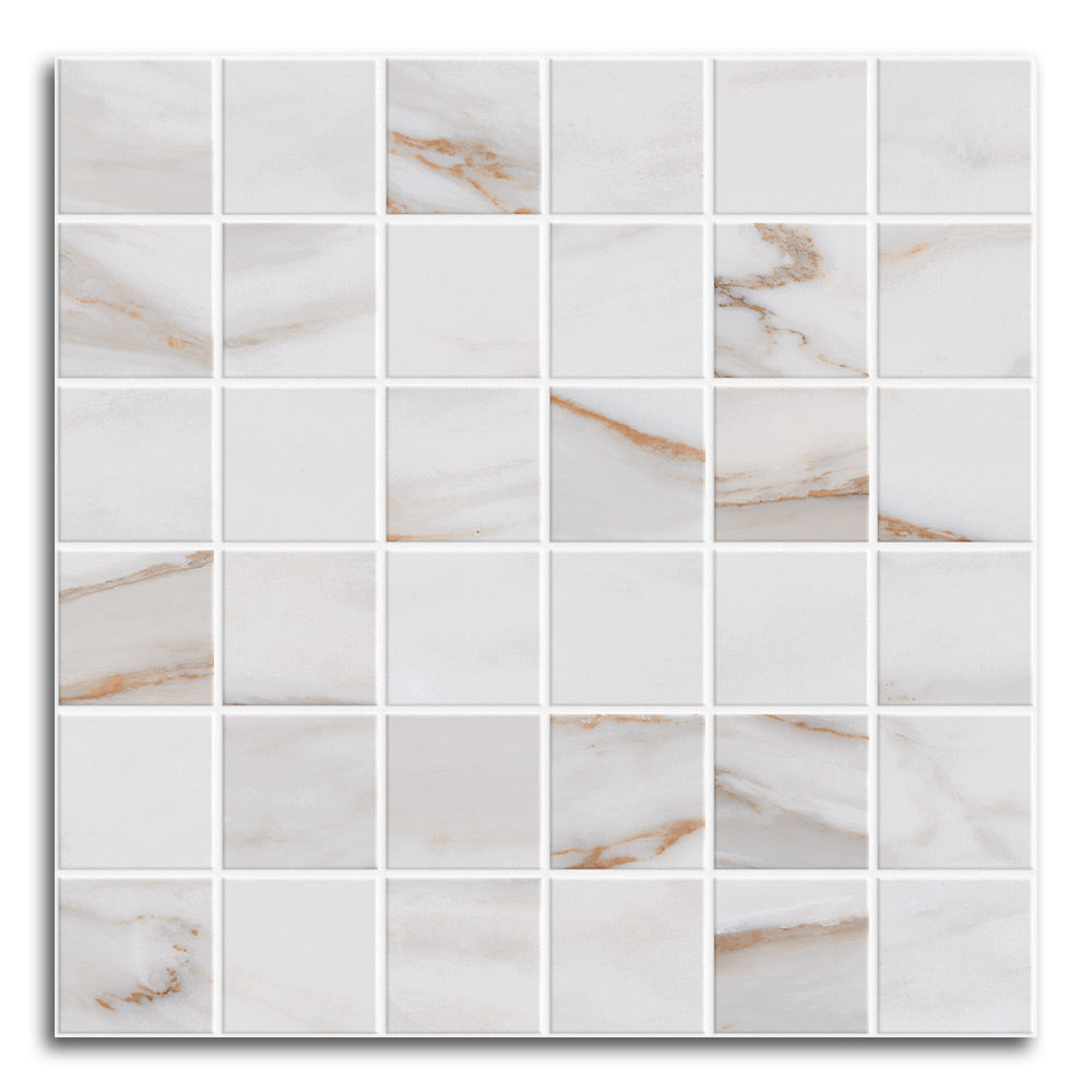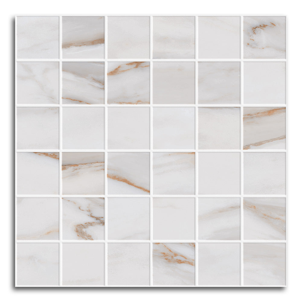 Made from high-grade porcelain, this mosaic offers durability for everyday use. Each sheet features 2" x 2" tiles with rich golden hues and realistic vein patterns. These tones mirror the beauty of natural travertine, without the maintenance headaches.